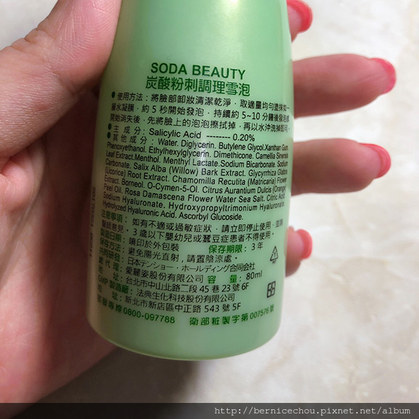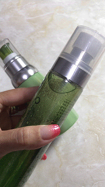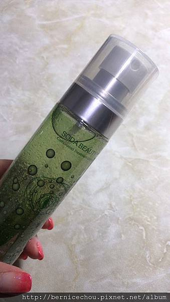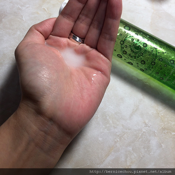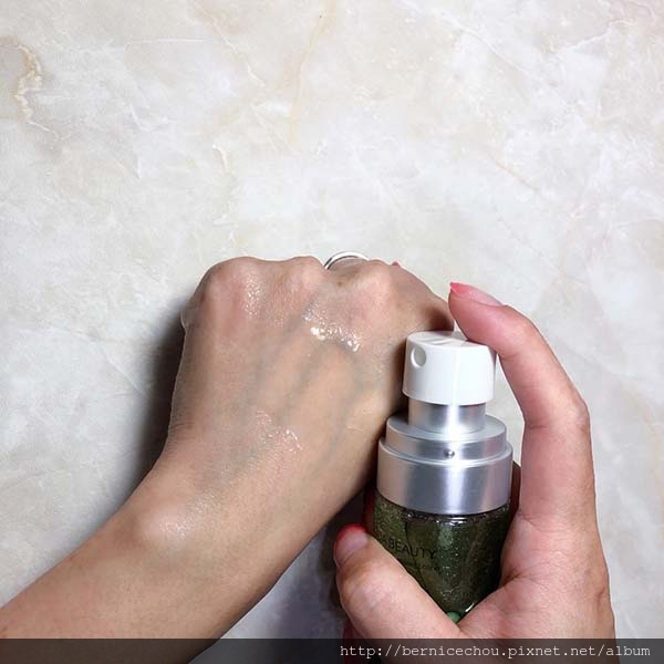 從瓶外看出是淡綠色帶點微型顆粒的泡泡