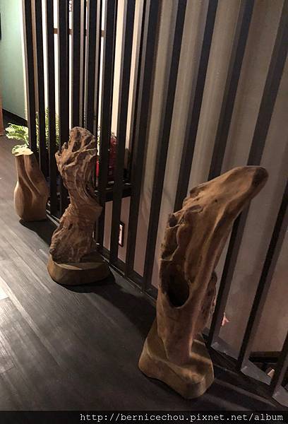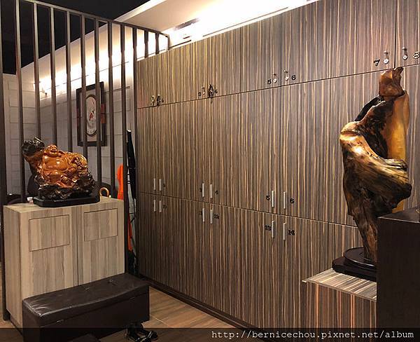 櫃台背後有寬敞的置物櫃,兩側落落大方的檜木裝飾雕刻
