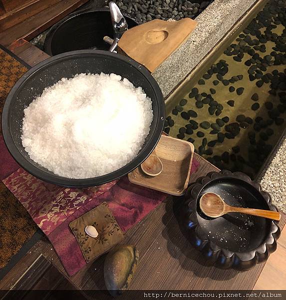 泡腳使用的是舒緩壓力、消除負能量的海鹽鹽湯