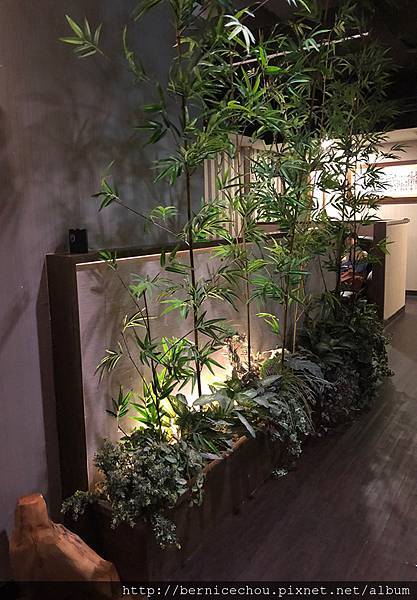 一排樹立著盆栽、竹子造景,為室內增添的許多綠意