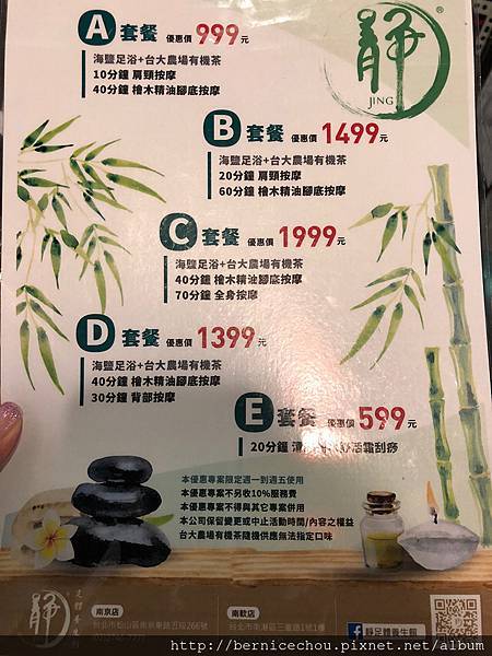 「靜足體養生館」的服務項目很多元,從腳底按摩、全身按摩、全身油推、頭肩頸按摩