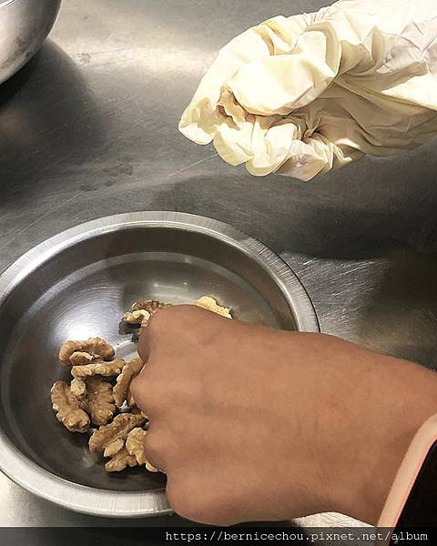 將糖粉、過篩麵粉、杏仁粉、核桃倒入裝著奶油器具裡
