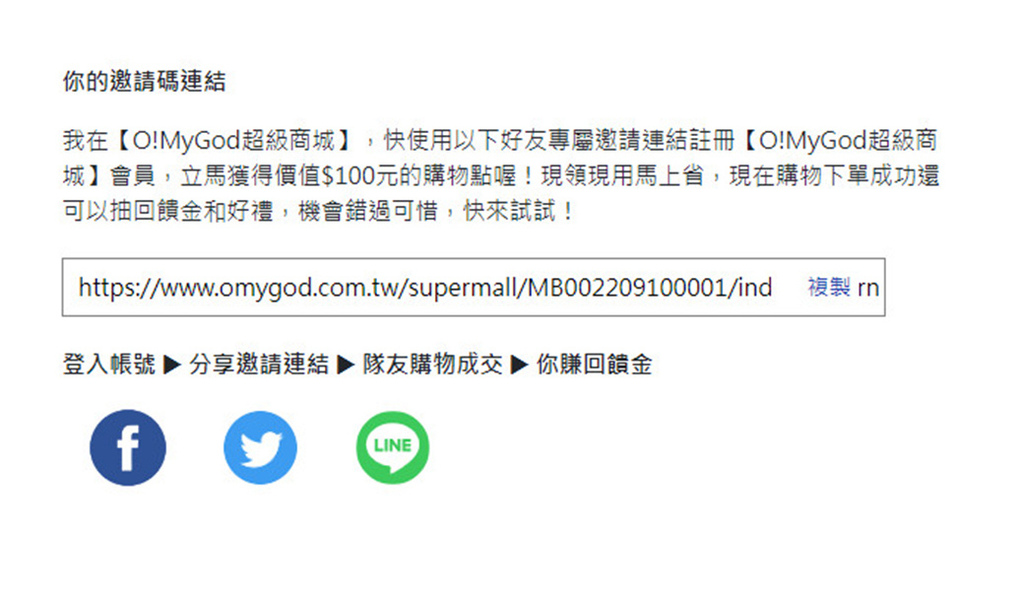 可以透過FB、Twiter、LINE分享出屬於你的專屬連結,