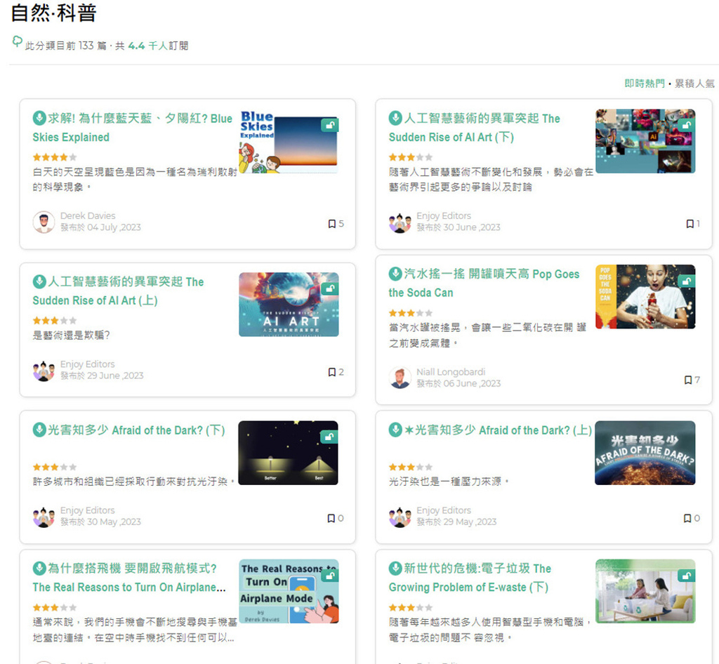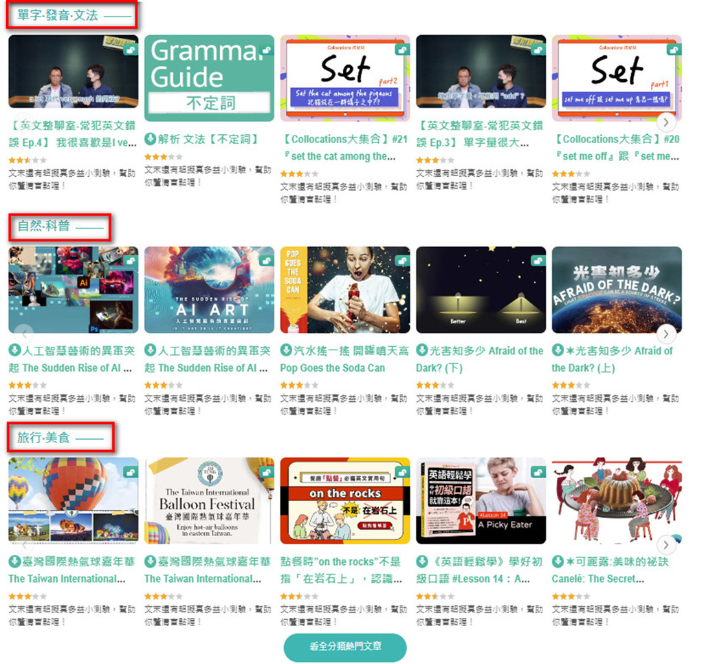 「自然科普」、「藝文娛樂」、「學習心得分享」,
