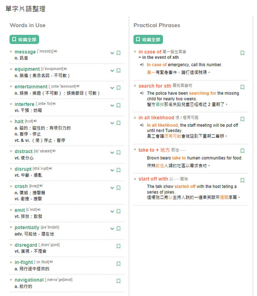「旅遊美食」、「職場實戰應用」、「題型演練」、