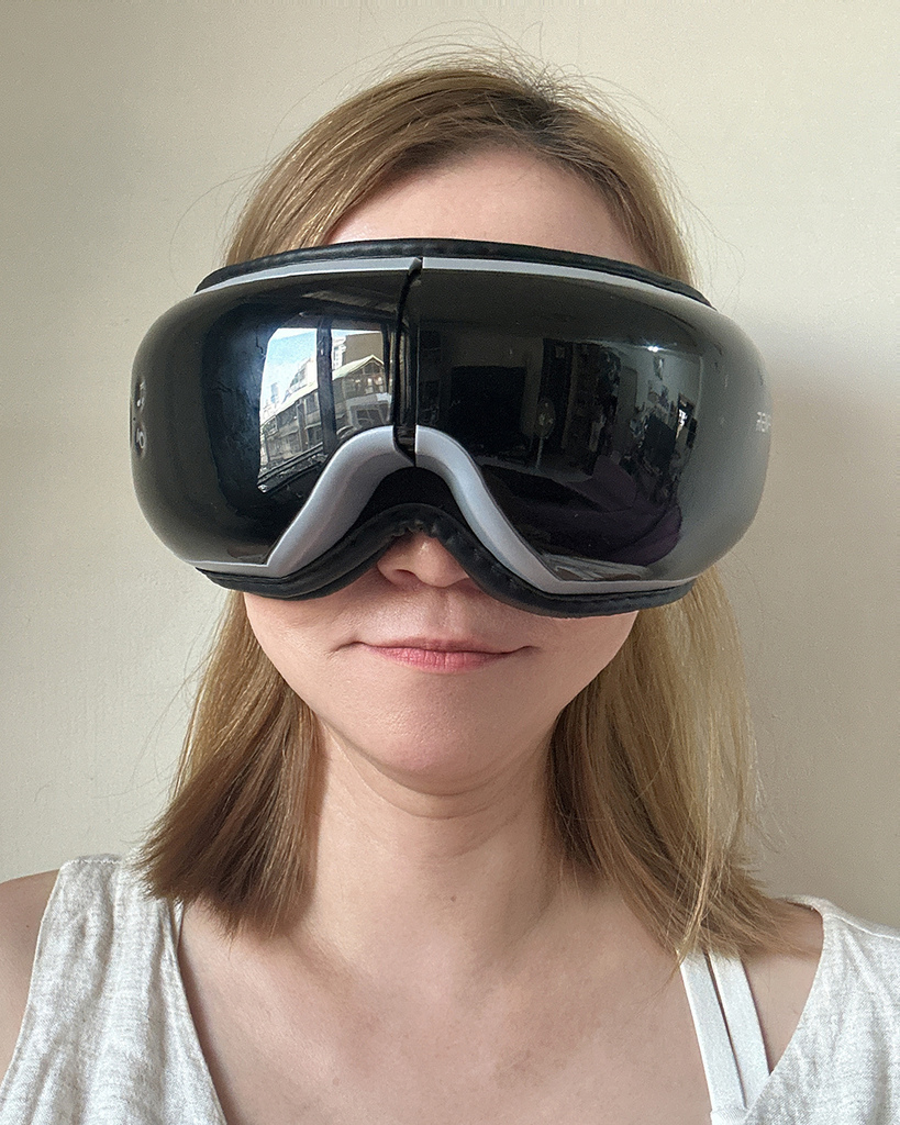 實際戴在臉上,開啟氣壓式熱感眼部按摩器,