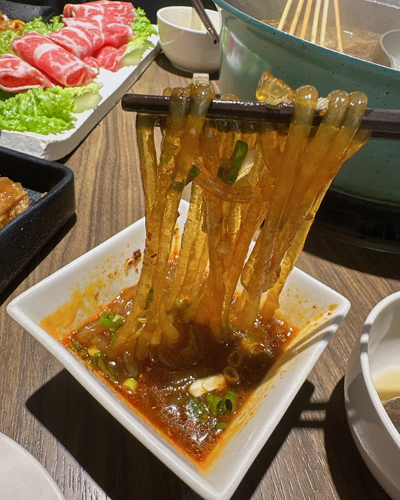 放入麻辣鍋裡,濃郁的香麻湯汁包覆著卜肉酥,