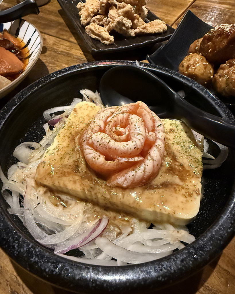 上面擺放著捲成玫瑰花朵的炙燒鮭魚,
