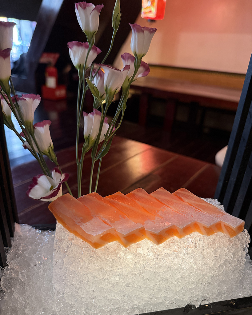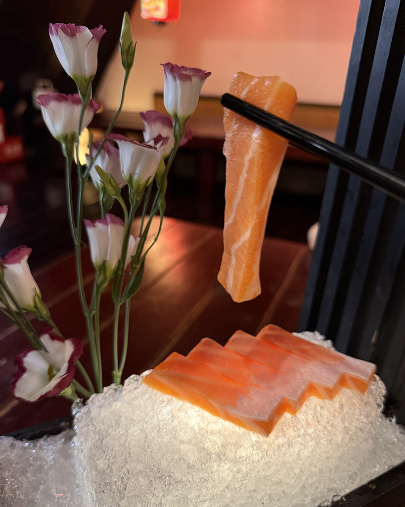 上桌的鮭魚生魚片一亮相,